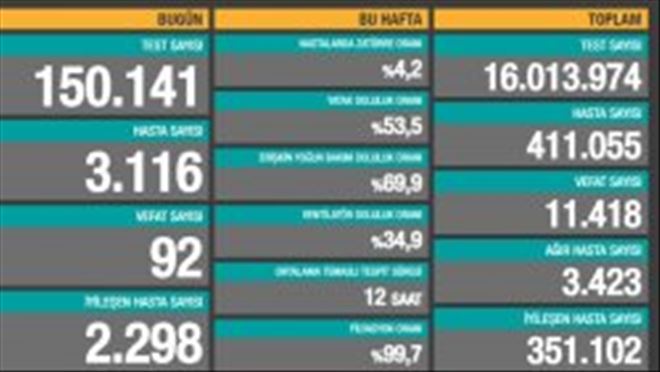 Koca´nın paylaştığı güncel tabloya göre bugün 3 bin 116 kişi daha koronavirüsle enfekte olarak hastalığa yakalandı.
