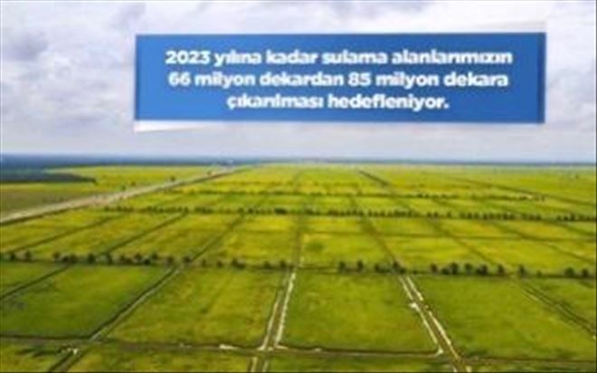 ?2023 yılına kadar sulama alanlarımızın 66 milyon dekardan 85 milyon tekrara çıkarılması hedefleniyor. ?18 yılda 1.700.000 kişiye tarımsal istihdam, 14 milyar zirai gelir.