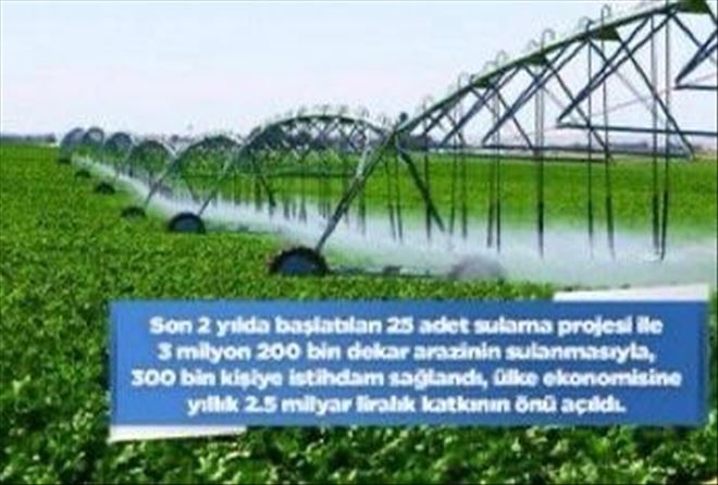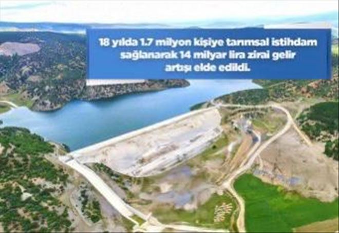 ?2023 yılına kadar sulama alanlarımızın 66 milyon dekardan 85 milyon tekrara çıkarılması hedefleniyor. ?18 yılda 1.700.000 kişiye tarımsal istihdam, 14 milyar zirai gelir.