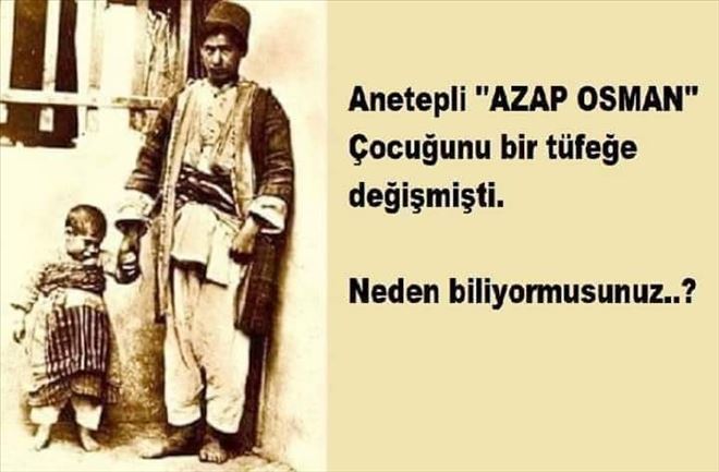 Gaziantep´te o günlerde, şehirde kime dokunsan patlayacak bir barut gibiydi.. Fransızlar Antep´i işgal etmiş; kadın, çocuk, yaşlı demeden Ermenilerin yardımı ile önüne geleni öldürüyorlardı. Sokaklarda patlama sesleri çığlıklara karışıyordu. Bir gün tüfekçi Yusuf´un dükkânına sinirden yumruklarını demir gibi sıkmış bir adam girdi.. Ve derdini anlatmaya başladı. ?Ağam adım Osman. Köylüler bana Azap Osman derler. Anlayacağın rençperim. Aynı zamanda da iyi avcıyım. Düşman çocuk, kadın demeden öldürüyor. Bana bir tüfek lazım. Elimde bir tüfeğim olsa attığım gâvuru indiririm aşağıya? diyordu. ?Ama en başından söyleyeyim cebimde hiç param yok.? Tüfekçi Yusuf karşısında dimdik duran adama uzun uzun baktı adeta boğazı düğümlenmişti. Ama ne yazık ki hiç tüfek yoktu elinde, olan tüfekler de direniş çetelerine dağıtılmıştı. Yeni tüfek bulmak da imkânsızdı. Daha Yusuf sözünü bitirmeden Osman dükkândan ayrılmıştı. İçinden söylene söylene yürüyordu. ?´Düşman bomba yağdıracak, ben de ölümleri izleyeceğim ha? Olmaz olmaz mutlaka silah bulmalıyım.?´ Eve gelmişti ve evde dört dönüyordu, mutlaka silah bulmalıydı ama satıp para edecek hiçbir eşyası da yoktu. Derdini karısına anlattı ?Şehre bomba yağıyor mutlaka silah bulmaylım!? Azap Osman bir çözüm bulmuştu. Ancak buldğu çözümmüydü yoksa çözümsüzlükmü onu bilmiyordu. Hanımına çözümü anlattığında kadının gözleri doldu. Boğazı düğümlenmişti kadının ama başka bir çaresi yoktu. Hemen suyu ısıttı ve bahçede oynayan kızı Ayşe´yi çağırdı ve sımsıkı sarıldıktan sonra güzelce yıkadı. Kınalar yaktı? Gece kızını yanına aldı uyudu ve sabah en güzel elbiselerini giydirdikten sonra ?hadi kızım baban seni biraz gezdirecek sakın babanın sözündn çıkma? dedi ve ikisini arkalarından ağlayarak uğurldı. Kadın konuşamıyordu, adeta hayat durmuştu o an kadın için.. Azap Osman´ın tüfekçi Yusuf´un yanına uğramsının üstünde tam 15 gün geçmişti ve yine uğradı. Ama bu sefer yüzü gülüyordu. ?Yusuf usta silah dedim yok dedin. Ben silahı buldum ama mermi almaya param yetmedi, bari mermiler senden olsun? dedi. Yusuf usta şaşırmıştı ?Nereden buldun bu tüfeği?? dedi, ?Uzun hikâye anlatırım? dedi Osman. Yusuf usta ?Tamam mermiler benden ama tüfeği nerden bulduğunu anlatırsan. Sen anlat bakalım nerden buldun bu tüfeği?? Osman derin bir nefes aldı ve biraz da sıkılarak anlatmaya başladı. ?Baktım ki şehirde her yaşta çocuk öldürülüyor. Benimde elinden öper bir kızım var, annesi akşamdan yıkadı, kınalar yaktı, sabah da en güzel elbiselerini giydirdi ve evden çıktık. Beraber Halep´e gittik. Orada çocuğu olmayan zengin bir aileye evlatlık olarak verdim. Halep´ten de o parayla bu silahı aldım ama mermiye parm yetmedi? dedi. Yusuf ustanın o an gözleri doldu. Sanki o mermileri kendisi yemişti. Buğulu gözleriyle gitti içerden zulaya sakladığı mermilerden Osman´a verdi. Osman dükkândan silahına sarıldığı gibi çıktı, koştuğu yerde sarıldığı silah değildi adeta kızına sarılır gibi sımsıkı sarılıyrdu. İşte Gaziantp bu anlatılmsı güç kahramanlar sayesinde kurtuldu. Şehitliği göze almış kahramanlardn daha kahramandı Azap Osman.. Bu ve bunun gibi onlarca kahramanlık destanlarıyla düşmana teslim edilmedi Antep, daha fazla ne söylenebilir..