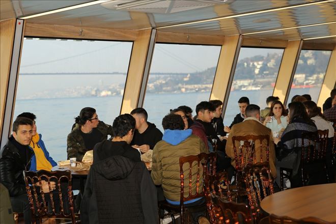 lçedeki devlet liselerinde eğitim gören yaklaşık beş bin öğrenci simit ve çay eşliğinde İstanbul boğazının tadını çıkarırken hatıra fotoğrafları çekiyorlar.